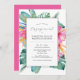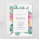 Esses convites de festa de noivado apresentam flores tropicais e folhas de palma em tons de rosa, laranja e verde. Use os campos modelo para adicionar seus detalhes personalizados. Solicite cartões impressos on-line ou convites imprimíveis. Uma escolha elegante para festas de jardim com temas tropicais. Para ver mais designs como esta, visite www.zazzle.com/dotellabelle Arte a aquarela exclusiva e design por Victoria Grigaliunas do Do Tell A Belle.