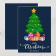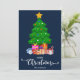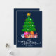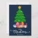 Azul escuro Feliz Natal em estilo de letra manuscrita com um gráfico de uma árvore de Natal e presentes embrulhados por baixo design. Este cartão de Natal de cor de fundo azul é projetado para que você possa alterar a cor do fundo e também inserir o nome da sua família. Você também pode editar este design para alterar a cor da palavra "Natal" se desejar.