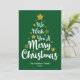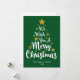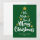 Desejamos um Feliz Natal em estilo de letra cursiva em forma de árvore em um cartão de Natal verde. Você pode alterar a cor do fundo e também do gráfico de texto principal e das estrelas e flocos de neve separadamente, bem como o nome da família e o texto do ano.