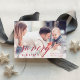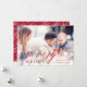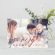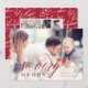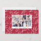Elegante cartão de foto de feriado apresenta uma foto orientada para paisagem com sangria total com uma sobreposição de brilho de luz bokeh para um visual festivo e alegre. "Muito alegre" é sobreposto em letra cursiva e letras maiúsculas em vermelho cranberry festivo, com o(s) seu(s) nome(s) e saudação personalizada ao lado. Adicione mais duas fotos no verso, junto com uma mensagem personalizada, em um fundo xadrez botânico vermelho e creme.