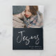 O Cartões de foto de Natal religioso apresenta um roteiro moderno de pincel branco sobre um belo fundo azul da meia-noite.