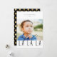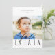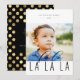 Elegante tipografia "fa la la la la", cartão com fotos de férias. A parte traseira da placa apresenta um quadro padrão de bolinhas de folha de ouro falso com linhas de modelo para a sua mensagem e nomes personalizados.