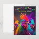 Este cartão de aniversário incrivelmente colorido apresenta três galinhas, uma no centro e duas à esquerda e à direita atrás dele. As galinhas parecem fotorealistas exceto pelas cores do arco-íris. No topo, o texto lê "Parabéns dos pintinhos loucos", fazer um cartão único e divertido para o aniversário de alguém especial.