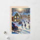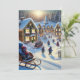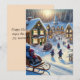 Um cartão de férias que retrata uma encantadora vila nevada onde as crianças andam alegremente de trenó, abraçando o espírito de aventura e maravilha.