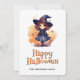 Feliz cartão de Halloween com a ilustração aquática de uma bruxa num chapéu. Personalize facilmente este cartão de Dia das Bruxas fofo para crianças com seu nome e texto de família.