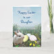 Sob um céu azul macio, o coelho branco fofo da Páscoa verifica um ninho de ovos de Páscoa azuis, cor-de-rosa e amarelos, aninhados na capa longa com a saudação, "Felz pascoa à nossa Filha" em escrevendo azul acima. A dentro da placa é vazio para você adicionar sua própria saudação pessoal. Este design pode ser um conjunto correspondente com placas de saudação de Páscoa e etiquetas de endereço.