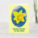 Fotografia do Fim-acima do daffodil amarelo quase perfeito mostrado em silhueta contra um céu azul com nuvens brancas, amarelo emaranhado. Estes imagem e design são usados para criar um amor, cartão romântico do papel do felz pascoa para sua esposa.