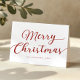Compartilhe a alegria da estação com este clássico cartão Feliz Natal com um elegante roteiro vermelho sobre um fundo branco limpo. Este cartão de feriado dobrado é simples, na moda e personalizável com seu nome de família e ano. Um design eterno que adiciona um toque quente e pessoal aos seus cartões de natal.