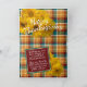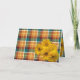 Cartão único, clássico, de moda, bonito e decorativo de Ação de Graças. GRATUITO FANTASIA DANDO aos OBRIGADOS texto e espaço para personalizar ou personalizar com uma foto e nomes (ou nome da família) de sua escolha. Com flores amarelas quentes e bonitas Mães de queda amarelas em um verde azul-lacrimogêneo, laranja-abóbora e vinho burgundy vermelho cor rústica da fazenda inspirou design de padrão de tartan xadrez. E um poema de saudação de estação personalizável no dentro do cartão.