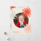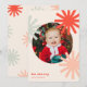 Este design de cartão de feriado fofo e divertido apresenta formas estilizadas de pompom/estrela/floco de neve azul-claro, rosa e vermelho formando uma foto redonda e texto lendo "Seja Feliz" em vermelho sobre um fundo de natas-claras. A foto, o nome e a saudação podem ser facilmente personalizados para um toque pessoal. Também disponível como download de cartão de Natal digital.