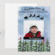 Belo cartão de inverno tem pinheiros pintados por aquarelas cobertos de neve no fundo com dois cardeais vermelhos nele estendidos. A tipografia diz: "Que nunca seja velho demais para revistar os céus na véspera de Natal". Uma silhueta preta de Papai noel e sua rena voa através do céu azul de aquarela. Personalize com sua foto favorita da família e seu nome para um cartão de Natal memorável para amigos e familiares. Projetado para você pela Digi-Zazzle It. Mais designs disponíveis no meu compro em www.zazzle.com/digiscrapthat.