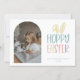 Cartão de Feriado de Foto de Páscoa Hoppy. Características, tipografia pastel com sotaque capilar, fotograma arquitetada e cor de suporte do chalé.
