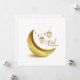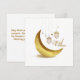 Um cartão simples e bonito, com um crescente lua de ouro, estrelas e lanternas para celebrar Eid com seus entes queridos, cartões de saudação Eid Mubarak moderno Elegante, você pode personalizar cartões Eid Mubarak com desejos de Eid Mubarak.