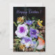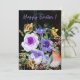 Encontre este cartão de férias oriental com rosas e flores azuis roxas fofas em um fundo preto com tons de rosa e verde.