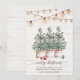 Envie desejos quentes e calorosos de Natal com este cartão de Natal rústico com pinheiros aquosos em burlap, lanternas de cordas, neve caindo e um fundo branco de madeira. Esta versão inclui uma mensagem impressa abaixo da letra "Feliz Natal", que oferece paz, alegria e felicidade para a temporada. Perfeito para aqueles que querem enviar uma saudação pronta para o correio com um encanto confortável de fazenda e um toque de elegância moderna.