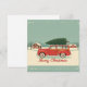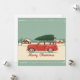 Envie uma dose sincera de nostalgia natalina com este cartão de Natal retrô. O design captura a calidez das memórias de feriados queridos, apresentando uma perua vintage vermelha com um pinheiro de Natal perfeitamente amarrado no topo, passeando por um bairro modernista de meados do século passado coberto de neve. Os tons suaves de vermelho, verde floresta, creme e azul claro evocam uma sensação aconchegante e atemporal, enquanto as bordas desgastadas e o efeito de papel texturizado adicionam charme vintage. Receber este cartão é como entrar em um filme clássico de Natal – uma maneira perfeita de compartilhar alegria e memórias neste Natal.