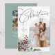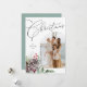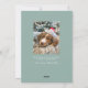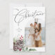 Este cartão com fotos de modelo de feriado apresenta a foto da sua família enquadrada em uma forma de arco de tendência. Letra elegante fluindo lê Feliz Natal. Apresenta botânicos de inverno desenhados à mão, incluindo bagas, pinheiros, pinos e folhas. Há uma foto atrás com uma mensagem pessoal de sua escolha.