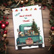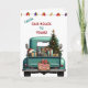 Um caminhão de picape azul teal carregar uma árvore de Natal decorada e pacotes de presentes na frente deste cartão de Natal bonito. Um cachorro Kelpie australiano preto e bronzeado olha pelo alfaiate. Um cartaz de madeira rústico na pára-choque diz "Feliz Natal". Na parte superior do cartão está uma série de luzes de Férias, e texto personalizado que diz atualmente "Da nossa casa para a sua". O dentro da placa tem mais campos de texto para personalização.