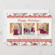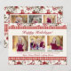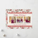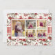 Um clássico padrão floral de inverno tradicional de poinsettias vermelhas, frutas e folhagens, com uma borda de gingham vermelha faz o fundo para este cartão que apresenta 3 fotos na frente, com espaço para a escolha da Saudação principal, além de uma segunda linha de saudação e uma linha para nomes, data ou citação favorita. O apresenta o mesmo padrão floral com espaço para 5 fotos e uma linha de texto ou data.