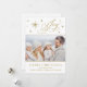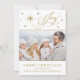 O Cartão De Natal De Joy Da Mão Elegante. Mande lindas saudações familiares com este elegante cartão azul e prateado de Natal. Esta carta apresenta uma bela alegria manuscrita em ouro, cercada por estrelas douradas e prateadas. Adicione facilmente sua foto de família ou nova foto de bebê no lugar da foto de estoque, para um toque pessoal.