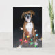 Cãozinho enredado em luzes no cartão de Natal