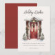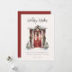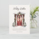 Cartão de Natal plano com imagem de porta da frente decorada com verde natalino e espaço extra no verso para mensagem pessoal com script moderno "Desejos de Férias" em aquarela.