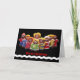 Adorável cartão de saudação de Natal, com uma foto da casa, fizeram homens de pão-de-gengibre todos decorados em cores brilhantes. Um fundo preto realmente faz esses biscoitos deliciosos se destacarem. Uma fita branca com aspecto para rack de rick e leitura de texto vermelho, Feliz Natal, na parte inferior é totalmente personalizável para dizer o que você quiser, assim como o dentro de saudação.