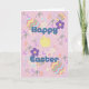 Este Cartão de Páscoa bonito para crianças tem coelhos, pintinhos, espirais, flores, estrelas, ovos decorados e é muito alegre. Obrigados ao hungryjpeg e ao WebdesignerLab para alguns dos elementos do design.