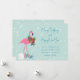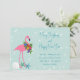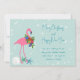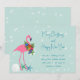 Cartões de Natal com flamingo e design de estrelas-do-mar. Estrelas giratórias cobrir o fundo de placas horizontais que são de cor azul-cinza-clara. O texto azul-marinho é fácil de personalizar em dois locais com uma saudação e uma mensagem, com assinatura. O flamingo cor-de-rosa veste uma coroa de flores de hibisco e folhas sagradas e se situa entre um dólar branco de areia e estrelas azuis do mar.