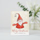 Crie cartões postais de Natal bonitos personalizados com saudações de Feliz Natal e gnomo alegre em roupas vermelhas festivas em um fundo bege rústico com flocos de neve. O texto modelo facilita a personalização. Feliz Férias!