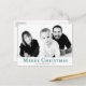 Cartaz de fotos na moda e Natal moderno com uma foto de cheio. Na frente do cartão é um desejo Feliz de Natal, o nome da família e o ano, e uma foto - insira uma foto da sua família ou de qualquer outra foto favorita na modelo. Na parte de trás está uma árvore de Natal feita com flocos de neve e nome de um remetente. Personalize todo o texto do cartão-postal ou apague-o.
