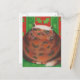 Um gato feliz de tortoisinferno (parecido com um pudim de natal!) senta-se em uma almofada verde contra um fundo vermelho e verde com padrão de folha oca. Cartão postal com um design personalizável para personalizar com seu próprio texto, imagens e ideias. Um desenho de lápis colorido original de Jess Perry.