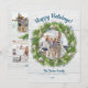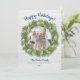 Para o seu cartão de Natal com tema náutico ou de praia, este cartão apresenta uma coroa de sempre-verde adornada com ornamentos de conchas brancas e bagas azuis, com espaço para a sua foto dentro da coroa na frente, e espaço para 3 fotos no verso, com sua saudação personalizada, nomes e data.