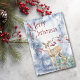 Simples beleza descreve a design neste cartão, com um pequeno veado parado debaixo de um galho vermelho. Aos pés da amora está um buquê de morango. O texto estilizado "Feliz Natal" está em vermelho no topo, e tudo é colocado sobre um fundo branco e azul de abstrato indigo com neve. A parte de trás da carta tem o mesmo fundo, com um pequeno pássaro de inverno estacionado em um galho. Seu texto personalizado está em três campos.