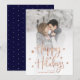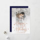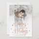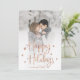 Este Cartões de foto de Natal simples e na moda apresenta um roteiro manuscrito faux rosa gold moderno que diz "Feliz feriado", e muitas estrelas elegantes, com sua foto pessoal favorita cobrindo toda a frente da placa.