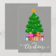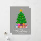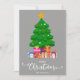 Cor de fundo da cinza Feliz Natal em letra de estilo de script com um gráfico de uma árvore de Natal e presentes empacotados sob sua design. Este cartão de Natal foi projetado para que você possa mudar a cor do plano de fundo e também digitar seu nome de família. Você também pode editar esta design para mudar a cor da palavra "Natal", se quiser.