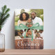 O cartão com fotos festivo apresenta quatro das suas imagens favoritas adornadas com uma ilustração do arco de fita de cor d'água verde. "Feliz Natal" aparece debaixo de letras brancas sobre um fundo rústico de madeira. Personalize com seus nomes e o ano.