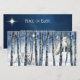 Paz no Cartão de Natal da Terra. Raposa Árctica na Floresta de inverno com Estrela de Belém brilhando através da floresta de inverno. Cartão plano com céu azul escuro e estrela de Belém nas costas. Mensagem de feriado personalizada para fazer a sua.