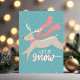 Um cartão de Natal/chamada não confessional plano com letras manuscritas que dizem "deixe nevar" e uma ilustração caprichosa de uma rena com cachecol saltitando pela neve. Envie um para todos que você "ama" nesta temporada de festas!