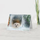 Este cartão de Natal caracteriza Snowdrop, um cão maltês pequeno doce que olha para fora de uma sala com uma árvore de Natal através de uma janela folheada da neve.