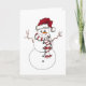 Bonito boneco de neve vestindo um chapéu de Papai Noel e um cachecol alegre. Cartão secular Excelente para os feriados!