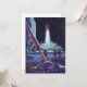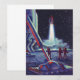 Ilustração vintage imagem futurista de ficção científica de alienígenas e robôs. Viagem e transporte design retrô de ficção científica com astronautas alienígenas amigáveis em um planeta estrangeiro acenando em despedida para uma nave espacial decolando para o espaço sideral. Estrelas brilhantes estão no céu noturno.