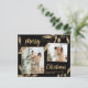 Orçamento, Elegante, Botânico Moderno Dourado e Negro Deixa 2 Colagem de Fotos Cartão Feliz Feriado de Natal (fino!). Nota: Mais fino que um postal! Este modelo de dois (2) cartões de fotos festivos, mimalistas, balísticos, apresenta uma bonito colagem fotográfica, folhas botânicas de folha de ouro falso, winterberry e diz Feliz Natal! O texto de saudação de "Feliz Natal" é escrito em um belo tipo de letra tipográfica com letras de mão sobre fundo preto. No verso, uma foto horizontal com a estrutura dourada e as folhas falsas de folhas de folhosas douradas sobre o preto. Escolher excelente para sua família e amigos nesta época de Natal e Férias. Cartões de natal baratos.