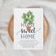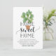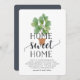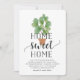 Convide amigos e família para sua nova casa com nossos charmosos convites de festas de aquecimento doméstico, apresentando uma vibrante ilustração verde de figueira em folha fig com "lar doce lar" em roteiro preto suave e tipografia de blocos. Use os campos modelo para adicionar sua introdução personalizada, essas informações e detalhes da parte.