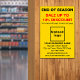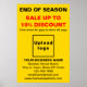 Poster que você pode usar como material de marketing para sua empresa para atrair mais clientes em cada final de temporada. Poster personalizável com venda de fim de estação, seu nome comercial e outras informações. Personalize-o e use-o para convencer mais clientes a comprar de seus produtos ou clientes para gostar de seus serviços no final da temporada. As cores e formas design são textos em preto e vermelho sobre fundo amarelo e forma retangular de formato retrato. O conteúdo é o fim da temporada, venda, desconto percentual que você oferecerá, datas de venda, seu nome comercial, logotipo, endereço, número de telefone, e-mail e site ou sua página de mídia social. Verifique a aparência após carregar o logotipo e digitar textos. Se a aparência lhe agrada, você pode colocar seu pedido agora. Se você precisar redimensionar e mover o logotipo e os textos para o ajustado neste poster ou em outro tamanho, forma e estilo apropriados que você escolherá, mude na ferramenta design. Você também pode fazer outras alterações na ferramenta design de acordo com a aparência deste poster, que você prefere, como alterar a cor do fundo, a cor da fonte e o estilo da fonte. Desejando mais vendas neste fim de temporada e em todas as estações.
