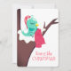 Pássaro super giro sentado em uma árvore, vestindo um chapéu de inverno, com agulha e fio, costurando tecido nesse cartão de Natal "feito à mão com amor" para dar sua lista com artigos e presentes feitos à mão.