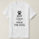 Fique Calmo e Ande a camisa do Cachorro para o andarilho. Chá engraçada para homens, mulheres e crianças que andam de cão. Crie sua própria paródia personalizada 'Fique calmo e carregar'. Modelo personalizável. Adicione sua própria citação ou ditado humorístico. Boa ideia para amigos e família com novos donos de animais. Vestuário personalizado com tipografia moderna e impressão de pata de cão.