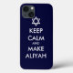 Apresenta texto lendo "MANTENHA CALMA E FAÇA ALIYAH." Aliyah (ע ל י ה), que significa sotaque, é a palavra hebraica para a imigração da diáspora para Israel. Aliyah é considerada como "subindo" na direção de Jerusalém. O que você está esperando?