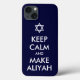 Apresenta texto lendo "MANTENHA CALMA E FAÇA ALIYAH." Aliyah (ע ל י ה), que significa sotaque, é a palavra hebraica para a imigração da diáspora para Israel. Aliyah é considerada como "subindo" na direção de Jerusalém. O que você está esperando?