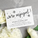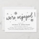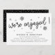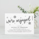 Os convites modernos de festa de noivado preto e branco apresentam "estamos engajados!" em caracteres de script de estilo manuscrito preto cercado por fogos de artifício e estrelas desenhadas à mão. Personalize com seus detalhes de festa de noivado em letras negras modernas.